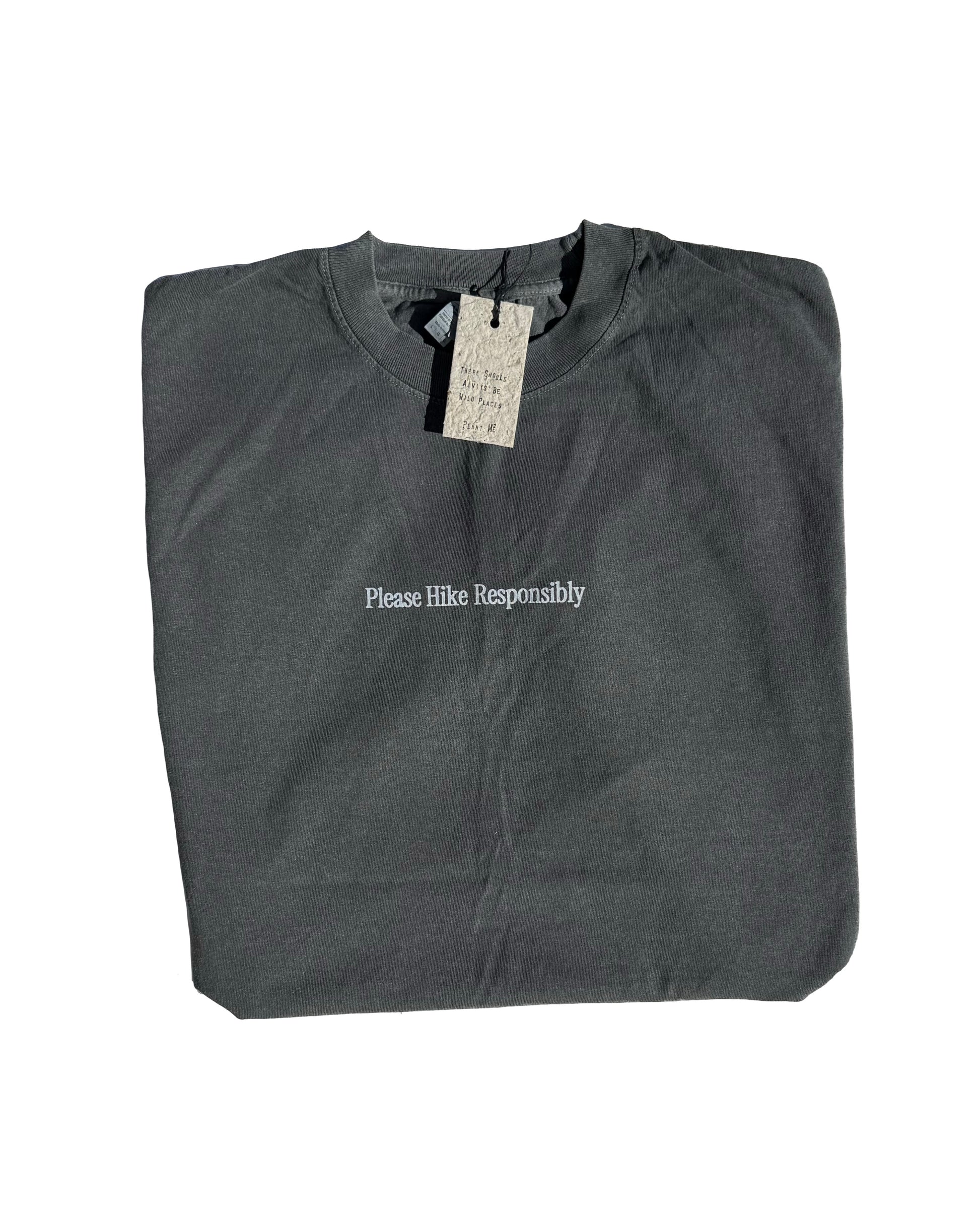 Use your wit, don’t get bit! This heavyweight tee brandishes a diamondback rattlesnake, the very image of danger, to remind us all to please hike responsibly.